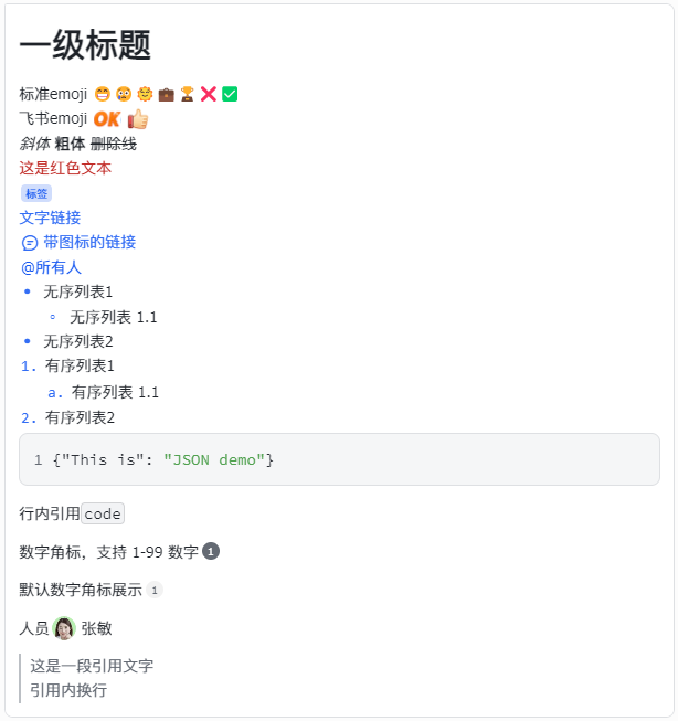 JSON 2.0 结构卡片的富文本(Markdown)组件支持渲染标题、表情、表格、图片、代码块、分割线等元素。